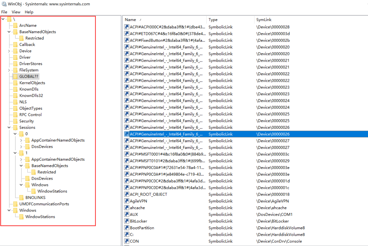 有没有什么现成的工具以供浏览当前系统中存在的内核对象呢?最好像Explorer浏览硬盘上的文件夹那样带有目录层次结构的。有,当然有,而且还是微软官方出品的,而且还不止一个。先看看傻瓜式的GUI工具——WinObj.exe。运行效果如下,注意,这个要以管理员权限运行。简单的介绍些该软件所呈现出来的内容。
