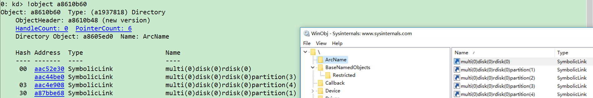 都出来了,原来是文件系统下的一个文件设备驱动对象。ok,分析完上边两个Directory中的对象后,再回到之前说的Windbg的自动化命令的输出,我们来对比下: