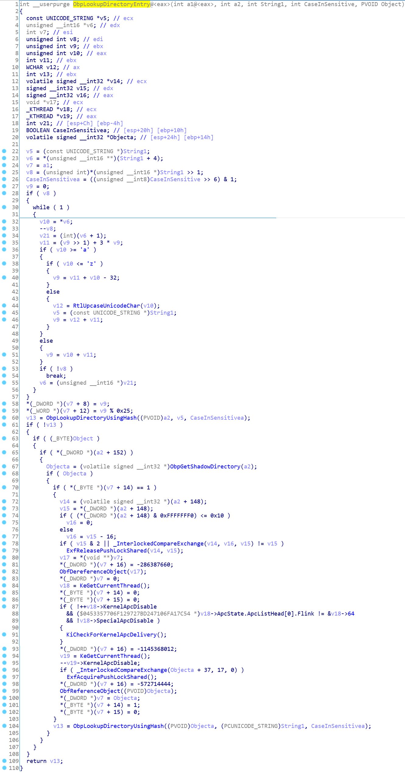 ObpLookupDirectoryEntry的完整C伪代码如下: