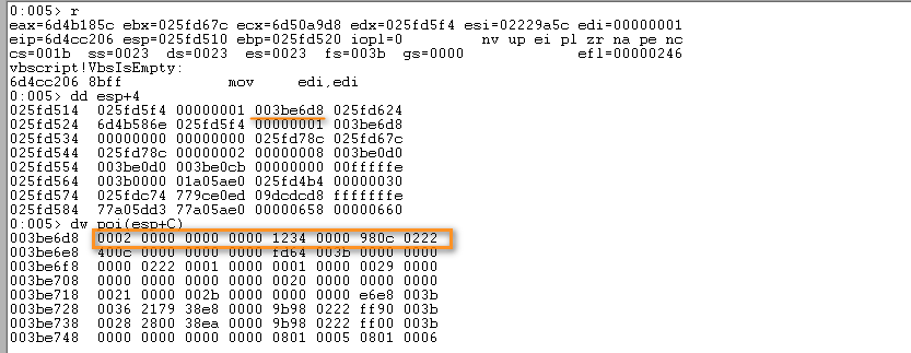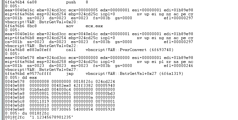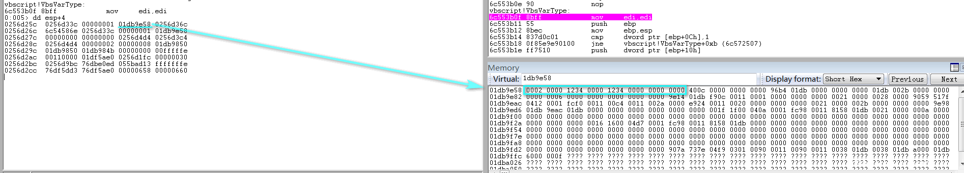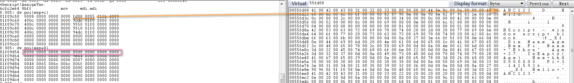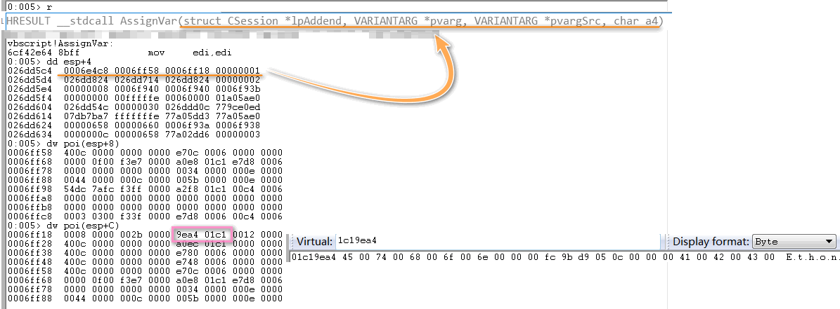 赋值对应函数为vbscript!AssignVar,于该函数处设断,查看其参数: