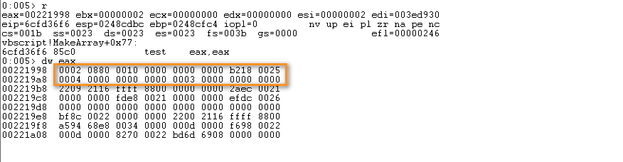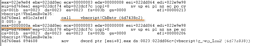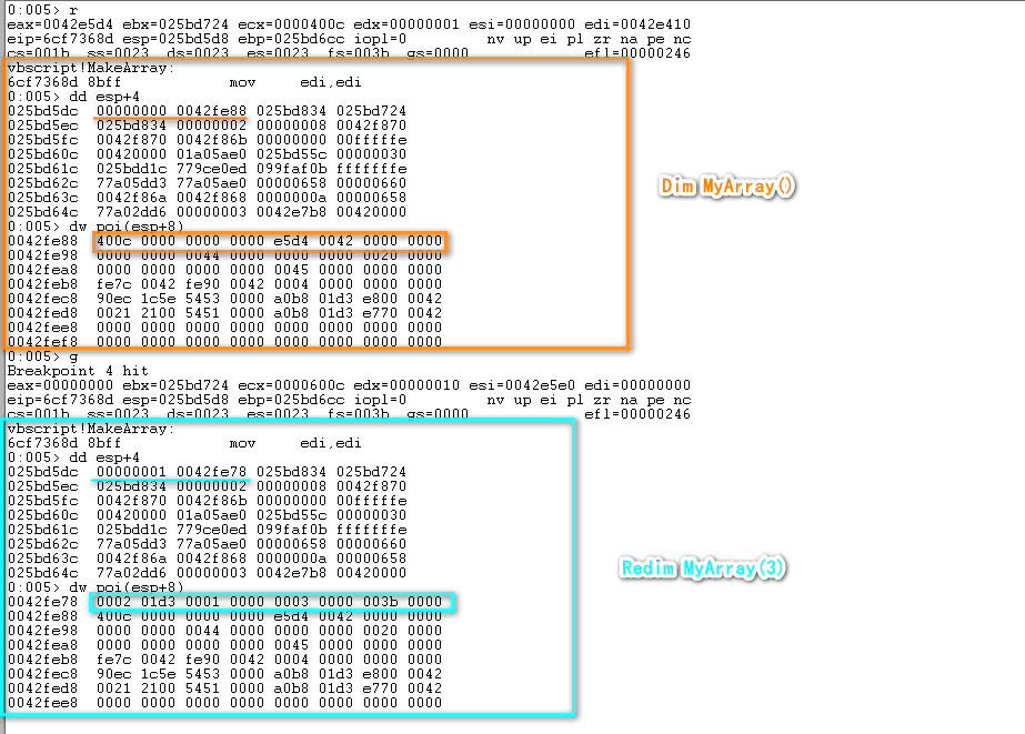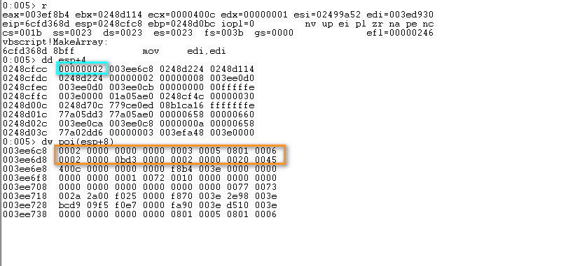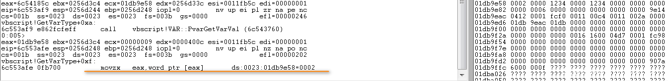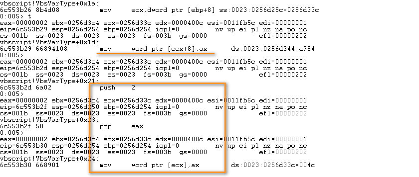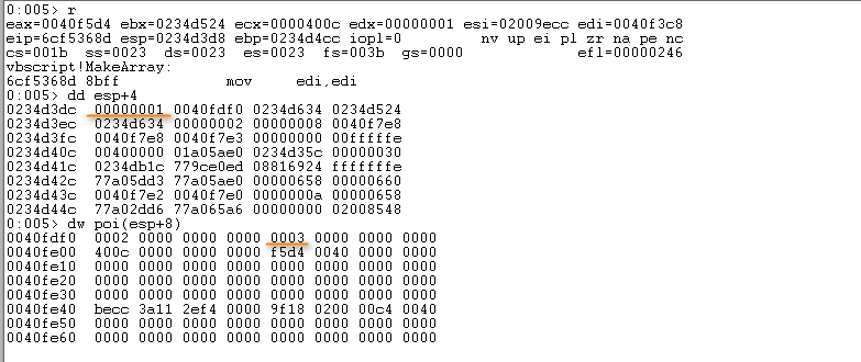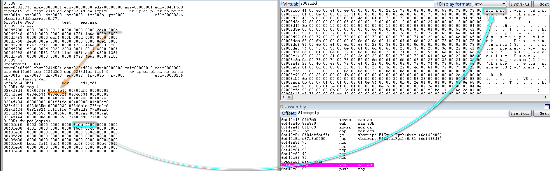 为数组元素赋值则直接将该元素所在内存偏移传递给vbscript!AssignVar: