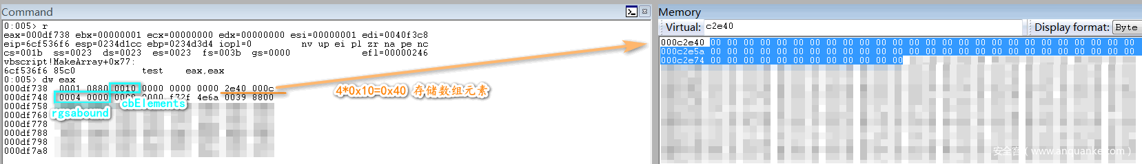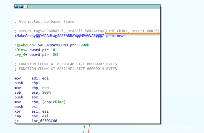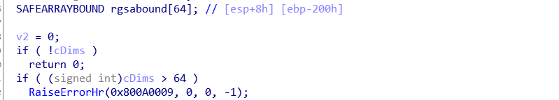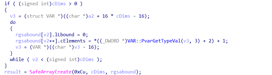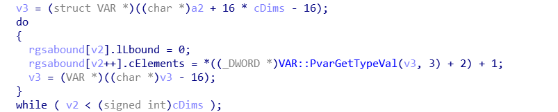 可以看到数组各维大小于内存中并列存储,之后调用VAR::PvarGetTypeVal逐一读取为rgsabound中cElements字段赋值: