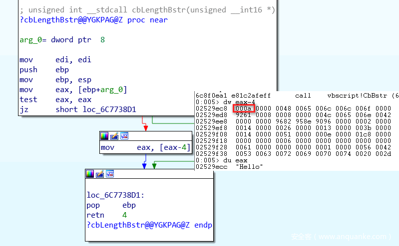 cbLengthBstr函数功能仅是读取字符串存储位置之前4字节内容,该内容为字符串长度: