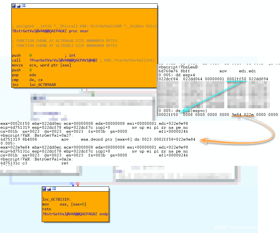 3.本篇文章是文章Internet Explorer漏洞分析(三)[下]——CVE-2014-6332的前置知识,对vbscrip.dll组件进行逆向分析,以及VBScript数据类型,数组,VarType函数,LenB函数详细分析,并介绍VBS脚本调试技巧