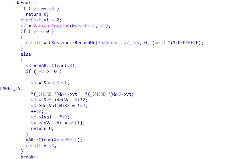 判断pvargSrc—>vt值(具体数值可自行分析,不赘述),若均不满足,执行如下语句: