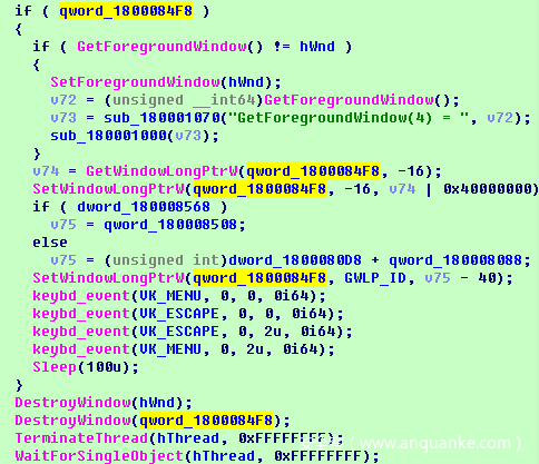 后门程序在启动时隐藏了自身窗口,创建了名为 com_mycompany_apps_appname_new 的互斥体,如果存在该互斥体,则退出程序,防止重复运行。