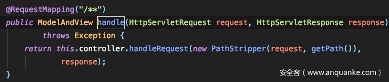 可以看到直接可以通过/jolokia来访问到该端点,handle方法用来处理请求: