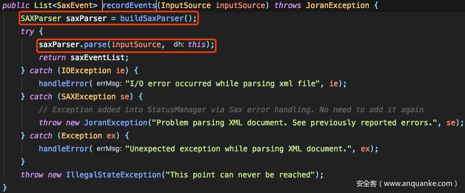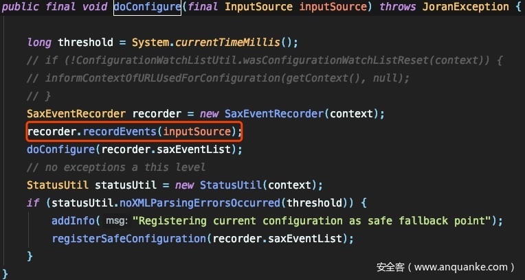 没有任何防护。也就是说这里是可以引入外部资源,同时解析xml文档的,那么这里起码就有一个ssrf,和一个没有回显的xxe。那么看一下这个所谓的JMX配置文件也就是logback.xml有没有什么可以搞的东西。在logbacks.xml中有这么一个标签: