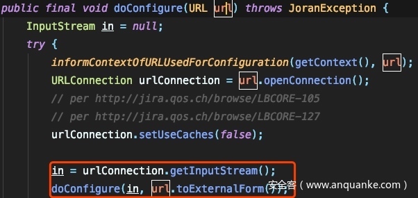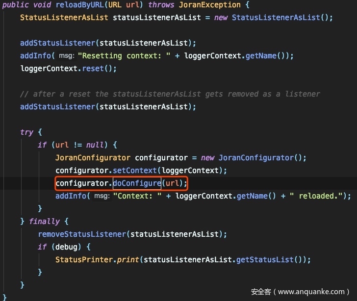 在JMXConfigurator这个类中发现存在一个reloadByURL方法,那是不是可以从远程加载一个新的配置文件从而造成RCE呢?感觉是有搞头的。那就着重看一下这个reloadByURL方法。
