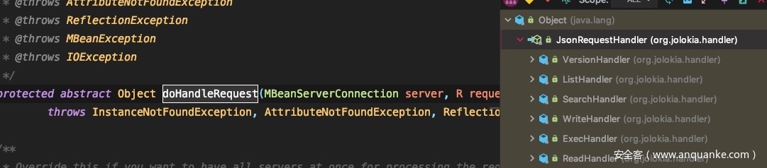 在继承类中我们发现存在JmxWriteRequest和JmxExecRequest这两个从名字来说让我们很兴奋的子类,我们知道/jolokia/list所执行的是JmxListRequest这个子类的功能,类比一下,/jolakia/exec就可以执行JmxExecRequest这个子类的功能。我们首先来具体看一下这个JmxExecRequest子类: