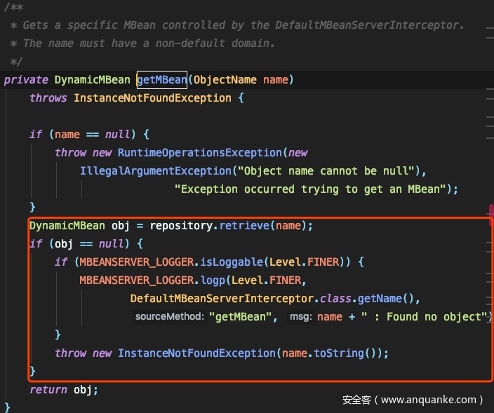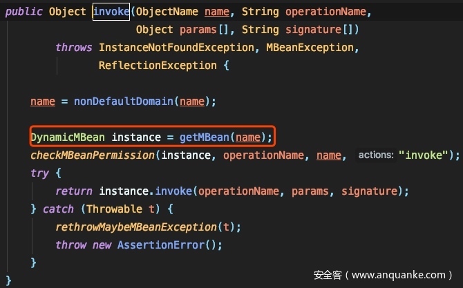 可以看到这里存在invoke方法最终会执行我们指定的类中的指定的方法,而指定的类以及指定的方法都是可以通过路由参数来设置的。那么这里是否可以随便设置一个类呢?如果你跟了一遍这个流程的话,你会发现这里你所指定的类是从MBeanServer中来寻找的,当找不到你所设置的类的话,会抛出异常: