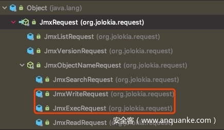 可以看到红框中通过JmxRequestFactory工厂函数来创建了一个JmxRequest类,之后执行这个类。在创建这个类的时候回根据get请求的路由来指定具体执行什么样的功能,也就是说请求的参数通过创建不同的JmxRequest类来实现不同的方法,那么我们只需要看一下JmxRequest的继承关系,看看它有什么继承类就能大致的知道它具备什么样的功能: