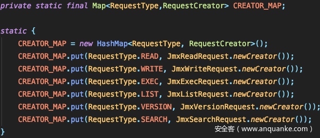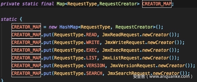在翻阅代码的过程中我注意到了这里,如果你自己跟了一下JmxRequest的创建过程的话,就知道首先是根据将请求的路由进行解析,将/之后的第一个字符串作为类别在CREATOR_MAP中查找是否存在该类别,如果存在则调用newCreate方法创建JmxRequest。下图为CREATOR_MAP:
