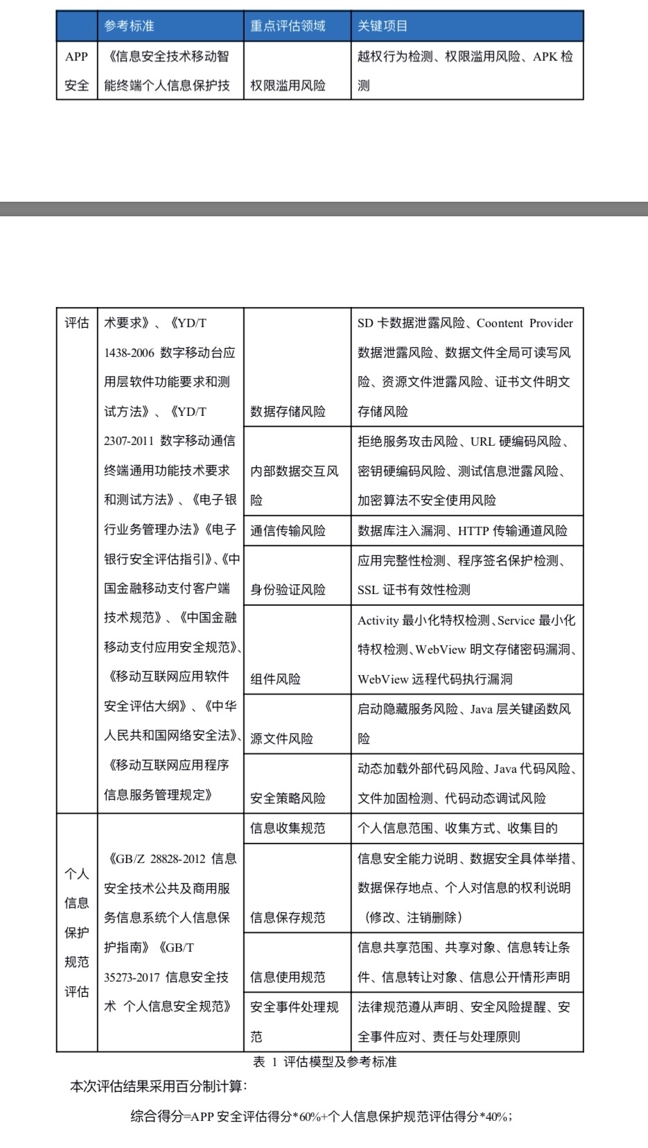 本次评估从APP安全和个人信息保护规范两个方面进行,APP安全评估参照《信息安全技术移动智能终端个人信息保护技术要求》、《YD/T 1438-2006 数字移动台应用层软件功能要求和测试方法》、《YD/T 2307-2011 数字移动通信终端通用功能技术要求和测试方法》、《电子银行业务管理办法》、《电子银行安全评估指引》、《中国金融移动支付客户端技术规范》《中国金融移动支付应用安全规范》、《移动互联网应用软件安全评估大纲》等相关规范进行,个人信息安全保护参考《GB/Z 28828-2012 信息安全技术公共及商用服务信息系统个人信息保护指南》、《GB/T 35273-2017 信息安全技术 个人信息安全规范》等标准并确定关键指标进行全面评估,并给出量化结果。本次评估主要模型如下: