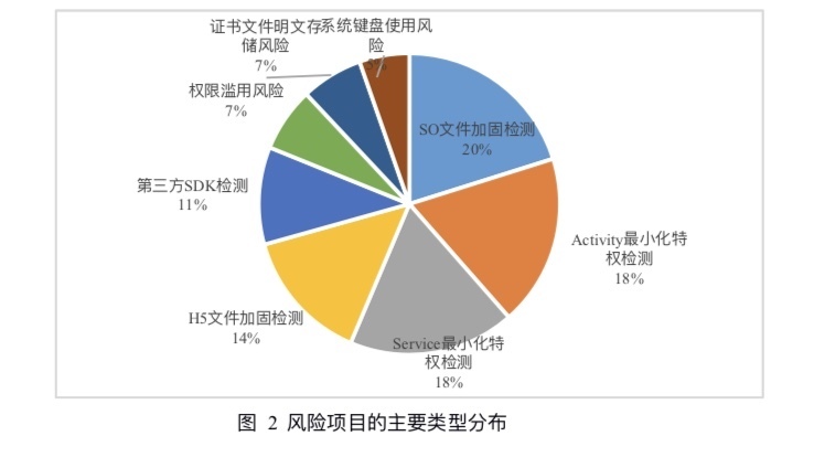 从风险项目的分布看,安全策略类的风险是占比最多的,主要包括SO文件加固、H5文件加固检测等,其次为源文件风险,如Activity最小化特权、Service最小化特权等检测项目风险较多。