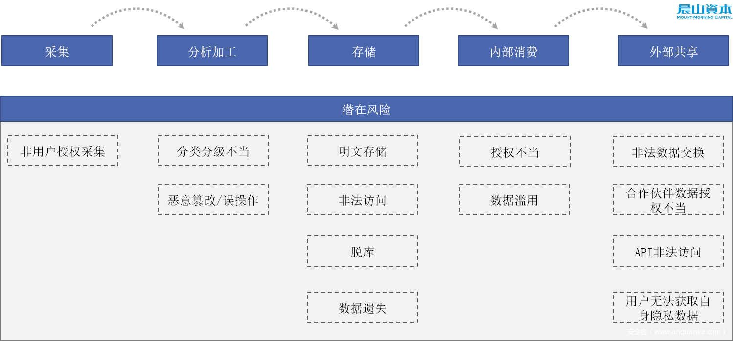 数据是信息时代最重要的生产资料。企业针对不同类型的数据往往有多个处理和加工环节,大体分类包括:数据采集、分析加工、存储、内部消费和外部共享等五步。企业采集的隐私数据在任何一个环节都面临着合规遵循的需求,以及内外部原因带来的数据泄露的安全威胁。