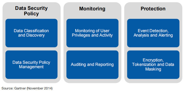 针对数据处理不同阶段面临的安全问题,Gartner在几年前就提出了DCAP(Data-Centric Audit and Protection)的概念。