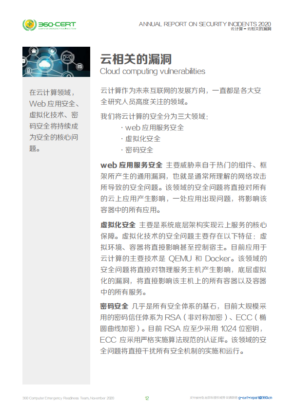 云计算是发展的趋势,越来越多的企业把自己的服务器、数据存储托管在云计算平台上。由此,云计算相关的安全管理和安全技术也迅速发展,受到各行各业的重视。2020年,云计算相关的安全事件频发,越来越多的数据泄露、网络攻击都与“云”联系起来,云计算的防护、安全策略、漏洞等逐渐成为了大家研究的重心。