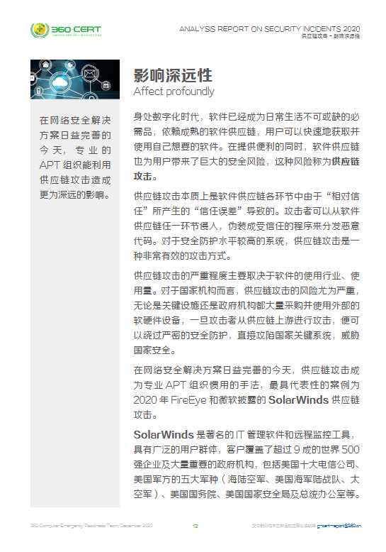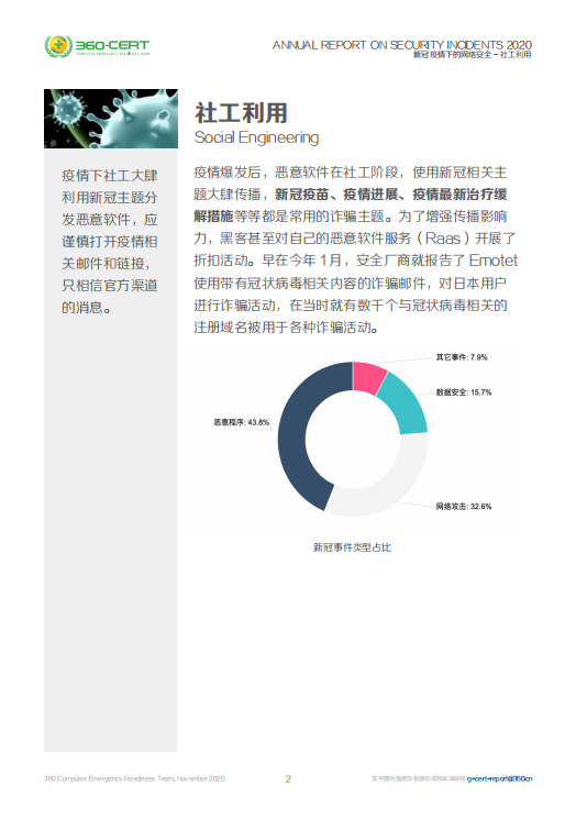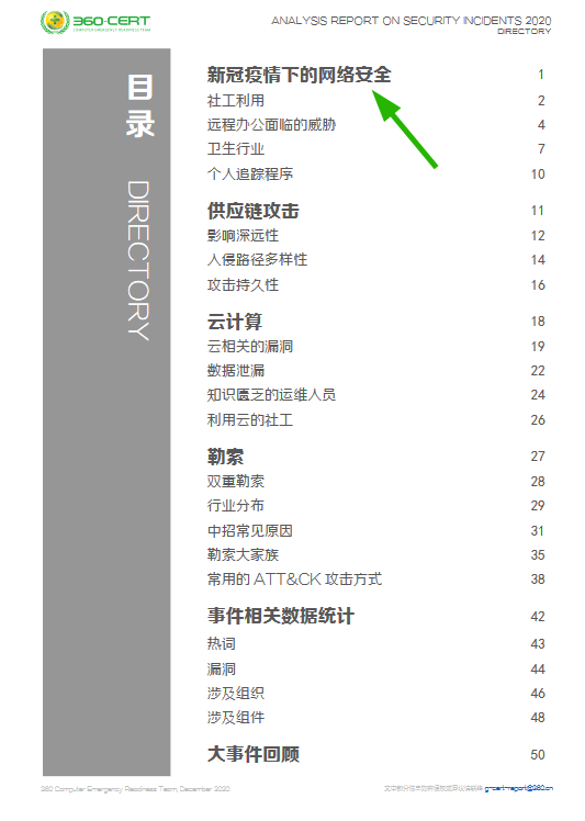 本次《安全事件分析报告-2020下半年》主要从新冠疫情下的网络安全、供应链攻击、云计算、勒索、事件相关数据统计、大事件回顾六个方面展开。