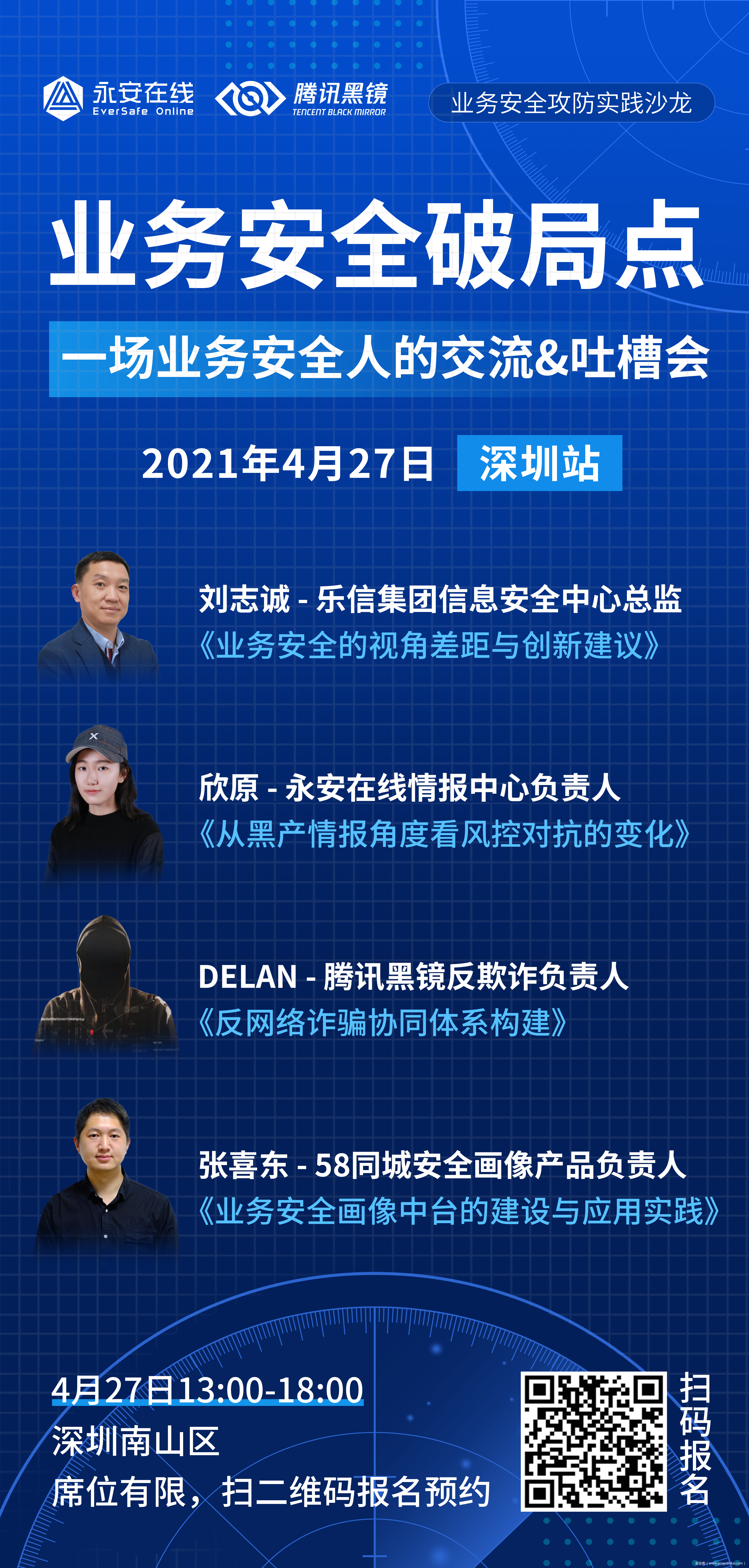 4月27日,永安在线将联合腾讯黑镜,邀请乐信集团、58同城相聚深圳,共话《业务安全破局点》,此次活动是永安在线继北京、上海站【业务安全攻防实践系列沙龙】后的第三站。此站活动,内容升级,从业务安全产品解决方案选型、业务安全画像中台建设到黑灰产视角下黑产攻击手段、资源的变化和网络诈骗的联防联控,分析视角更全面,解读更深入。
