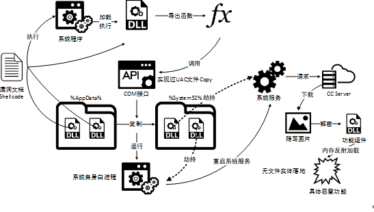 此次捕获到的APT攻击,攻击者通过投递内嵌恶意网页的Office文档的形式进行攻击,所有的漏洞利用代码和恶意荷载都通过远程的服务器加载。攻击的后期利用阶段使用了公开的UAC绕过技术,并利用了文件隐写技术和内存反射加载的方式来避免流量监测和实现无文件落地加载。