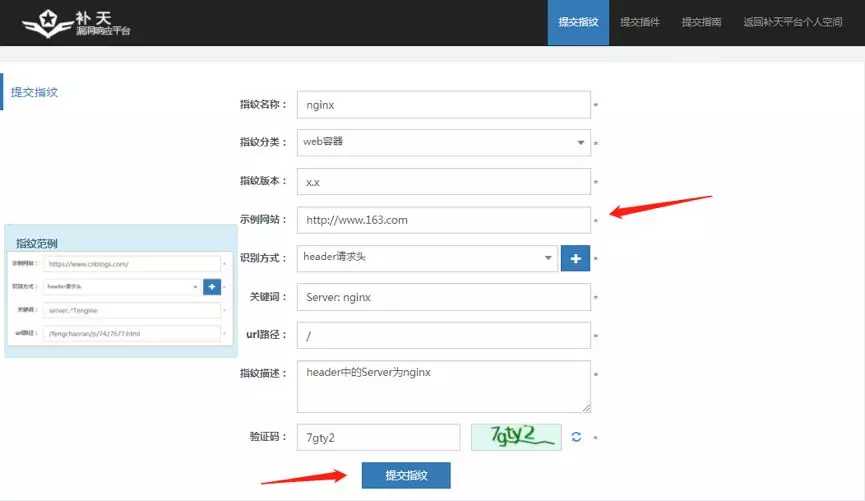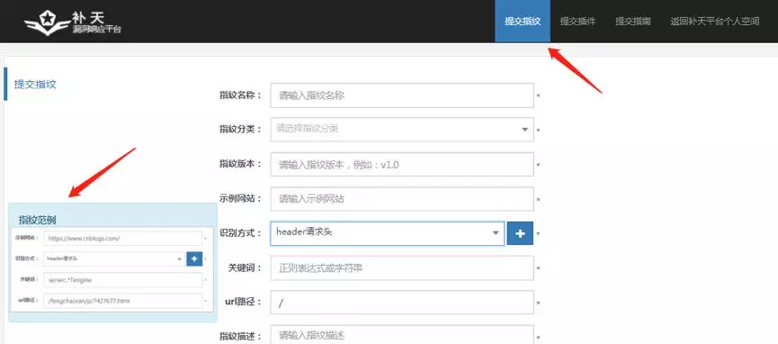 点击提交指纹按钮,打开提交页面。 还有指纹范例提示,白帽子朋友们可以更快更准的进行编写和提交。