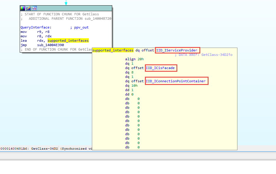 我们列出了QueryInterface支持的supported_interfaces,根据注册表中发现的信息来命名每个GUID。这里IID_ICisFacade这个riid用来返回CisGate对象,另一个比较有趣的目标是IID_IServiceProvider。查看IID_IServiceProvider?source=post_page—————————————-)官方文档,貌似该接口可以给我们提供很多信息。在Cis.exe(Comodo GUI Client)中搜索IID_IServiceProvider GUID,发现Comodo的确在使用该接口。逆向分析代码逻辑后,我们可以澄清自己如何使用该接口、Comodo想使用的服务以及想执行的操作。