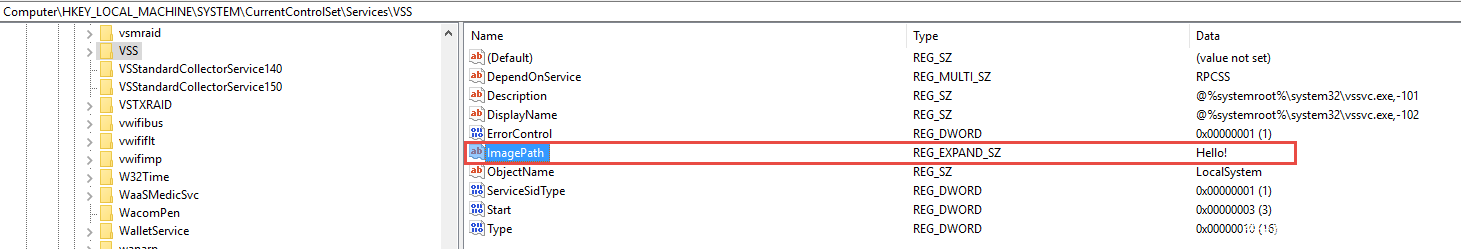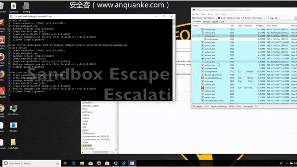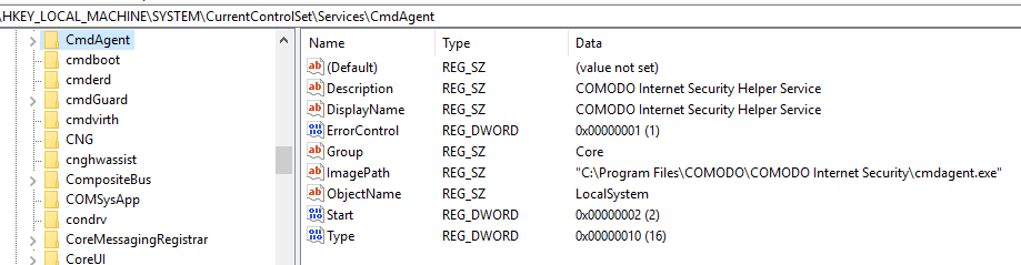 稍微总结下,我们运行沙箱化应用,对Comodo签名的程序执行Process Hollowing操作(以便绕过CmdAgent的签名校验机制),然后通过该程序运行我们开发的COM代码,从我们“沙箱化的”进程中以SYSTEM权限执行注册表写入操作。如果想通过这种方法实现权限提升,典型的方法就是劫持已有的服务,这里我们可以选择CmdAgent.exe。通过替换注册表HKEY_LOCAL_MACHINE\SYSTEM\CurrentControlSet\Services\CmdAgent对应的ImagePath值,我们就可以将CmdAgent服务替换成我们自己的程序,然后以SYSTEM权限运行。