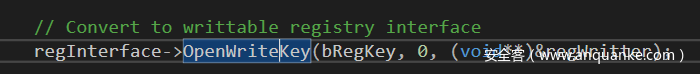 显然,如果我们调用该方法,就能以SYSTEM权限执行注册表写入操作,因为我没有在代码中找到对任何身份模拟API的调用。我们修改了自己的COM客户端代码,获取IServiceProvider,解析ISvcRegistryAccess,然后调用这个“注册表写入”方法。如果我们观察通过调用GetRegInterface来获取regInterface的过程,就可以看到CmdAgent.exe实际上只创建了一个只读的注册表键值句柄,因此尝试调用这个“写注册表”方法就会出现ACCESS_DENIED问题。幸运的是,我发现了ISvcRegKey vtable中由另一个方法,通过传递一些额外参数,可以将我们的注册表句柄变成“可写”状态。