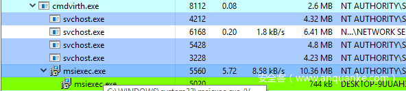 实际上,这也是RPC/ALPC沙箱隔离的工作原理。RPC/ALPC流量会被转移到沙箱化的Svchost.exe实例(参考上图),这是因为!comodo_6会附加到沙箱化进程尝试连接的端口名,而沙箱化的Svchost.exe实例也会创建附加!comodo_6的端口名。如下图所示,我们可以看到沙箱化的MSI安装程序尝试运行,发起RPC调用后最终会创建沙箱化的MSIexec.exe服务组件(父进程为cmdvirth.exe)。