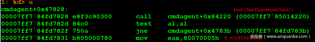 在调试器中调试CmdAgent.exe,可以看到程序会收到我们执行的CreateInstance调用,并且进入一个自定义的E_ACCESS_DENIED消息分支。