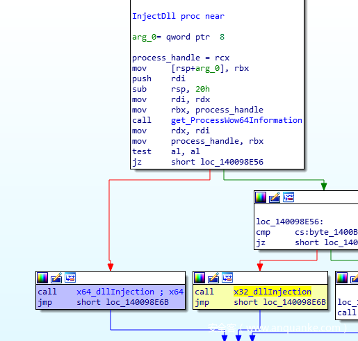 这个过程比操作我们自己的PEB还麻烦,但能给我们带来更大的优势。通过这种方法,Cmdguard.sys驱动就不会注入Guard64.dll,因此也不会在我们的进程中设置各种hook。如果目标进程“不可信”,那么Cmdguard.sys就会调用InjectDll例程,如下图所示。如果我们对C:\Program Files\COMODO\COMODO Internet Security\CmdVirth.exe执行Hollowing操作,那么就可以绕过IsProcessUntrusted检查,因为驱动会根据可执行文件路径来判断该程序为可信程序,因此会成功放行。