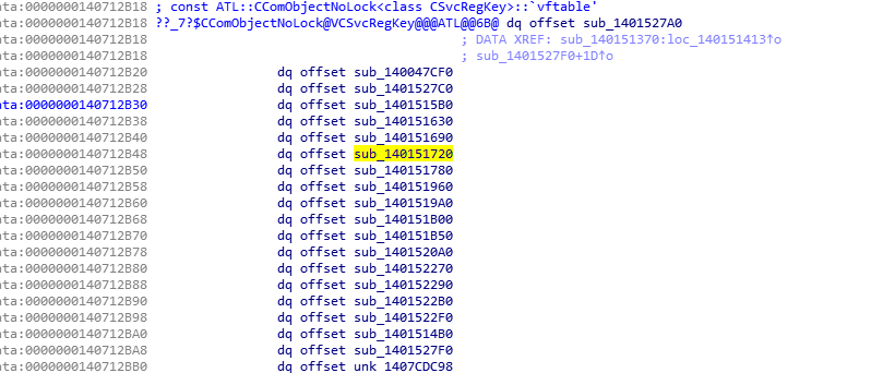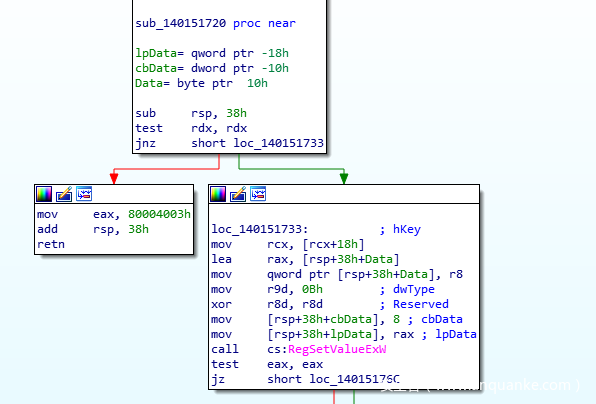 现在来看一下这个COM对象是否支持注册表写入。进一步研究vtable后,我们看到其中某个方法会调用RegSetValueExW。