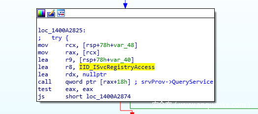 Cis.exe会使用IServiceProvider来执行QueryService操作,用来获取Comodo定义的SvcRegistryAccess对象,部分代码片段如下图所示: