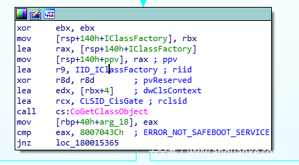 该代码流程中对CoGetClassObject的调用比较有趣。CoGetClassObject会返回指向某个接口的一个指针,而该接口对应与CLSID关联的某个对象。在注册表中查找后,我们发现这个CLSID对应“Cis Gate Class”,并且很快我们意识到CAVavWp.exe与这个类没有任何关系,该类对应的实际COM服务端为CmdAgent.exe。
