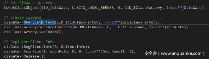 逆向分析这个shell扩展接口后,我发现其中Comodo实现了一个“扫描”客户端COM例程。理解这个函数可以帮助我们了解如何构造自己的COM客户端。