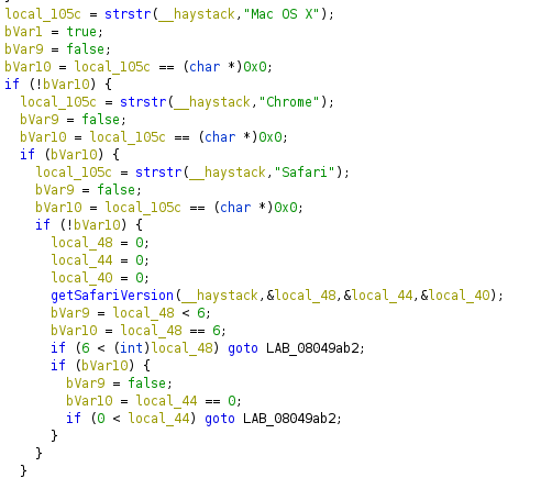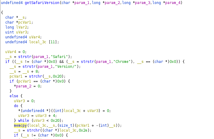 我在同一个CGI中找到了第二个漏洞,可以实现任意代码执行。这是一个缓冲区溢出漏洞,位于服务端解析浏览器user-agent信息的过程中。更具体一些,当攻击者将user-agent伪装为Safari时就会触发溢出,此时服务端会调用libSys.so库中的getSafariVersion函数。