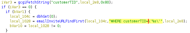第一个漏洞为SQL注入漏洞,位于customerTID参数中。目标Web应用使用的是SQLite数据库,并且使用了sqlite3的printf函数,根据用户提供的输入构造了几个查询语句。在大多数情况下,服务端使用%q格式化符号来转义引号。然而在某些情况下服务端使用的是%s,如下图所示。此时这里不存在任何转义操作,因此存在一个SQL注入点。