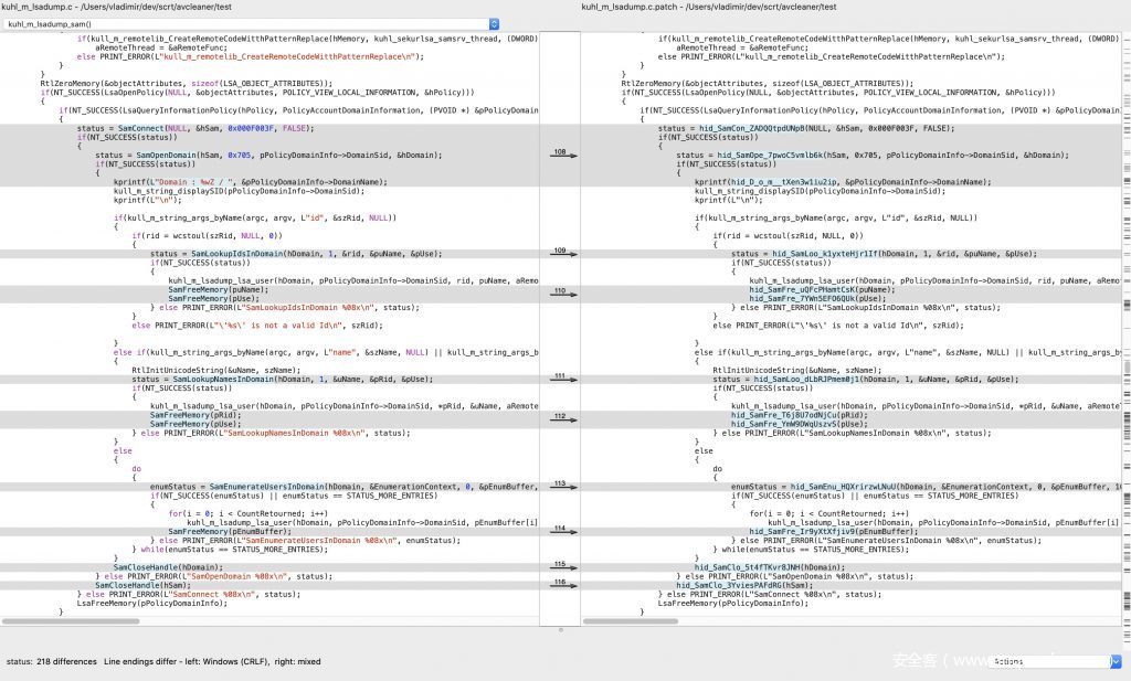 最后,我们可以对mimikatz(尤其是kuhl_m_lsadump.c)进行混淆测试: