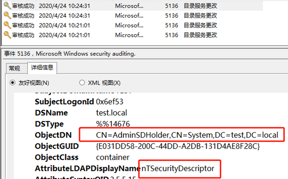 不过这样也有一个坏处就是所有的受保护组的ACL中都会被添加上这一条作为后门的ACE,隐藏其中一个账户并不能起到作用,所以还是比较容易被发现的。并且添加时会产生一条ID为5136的事件日志。
