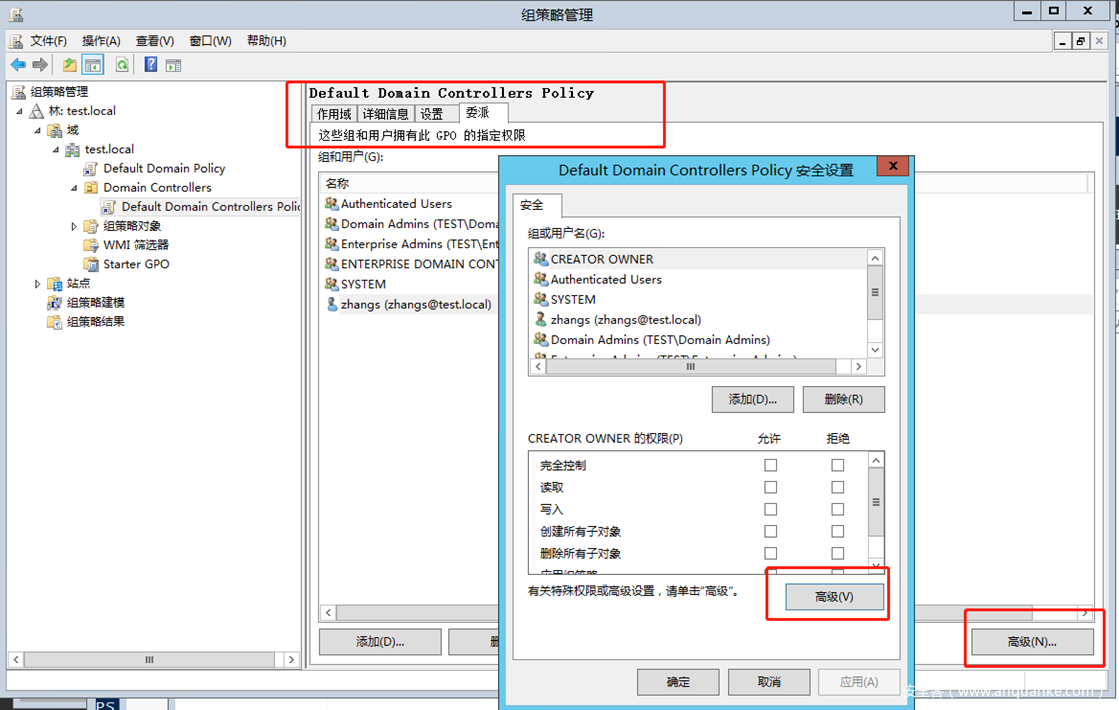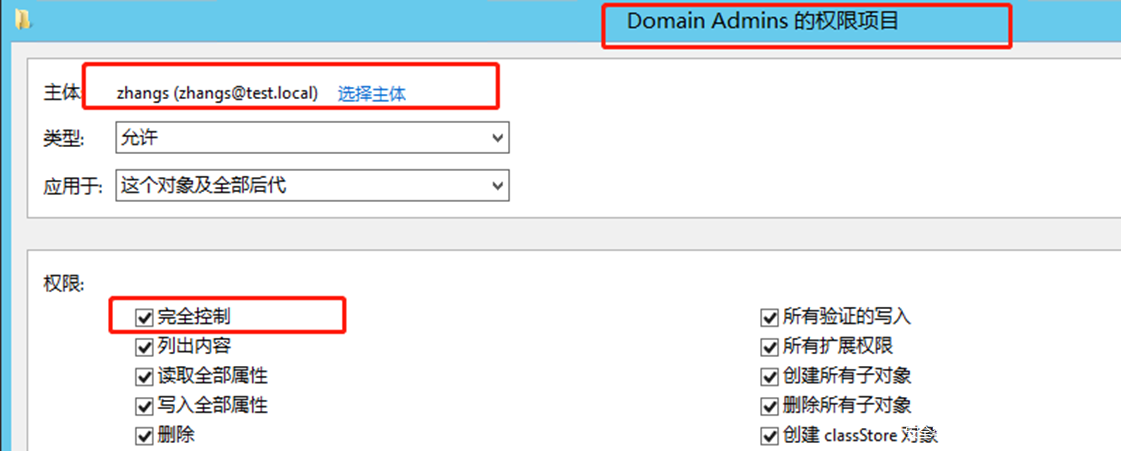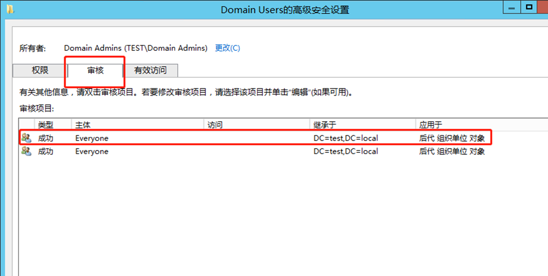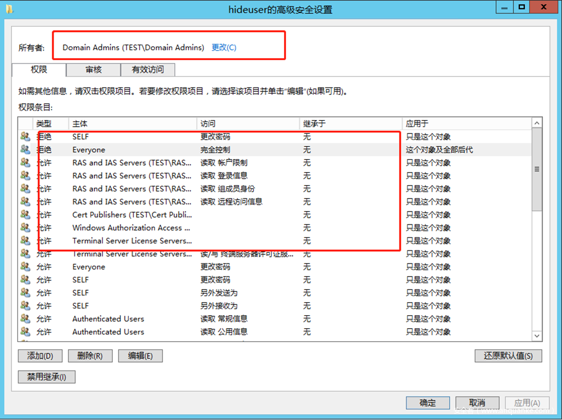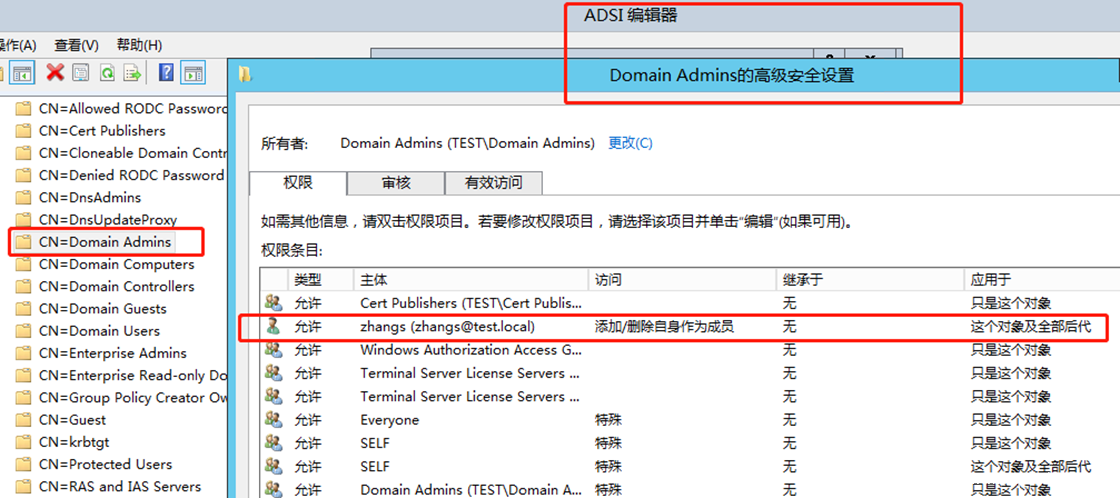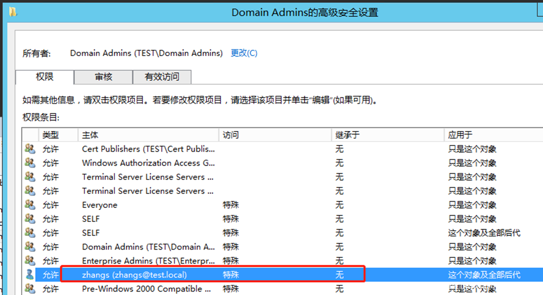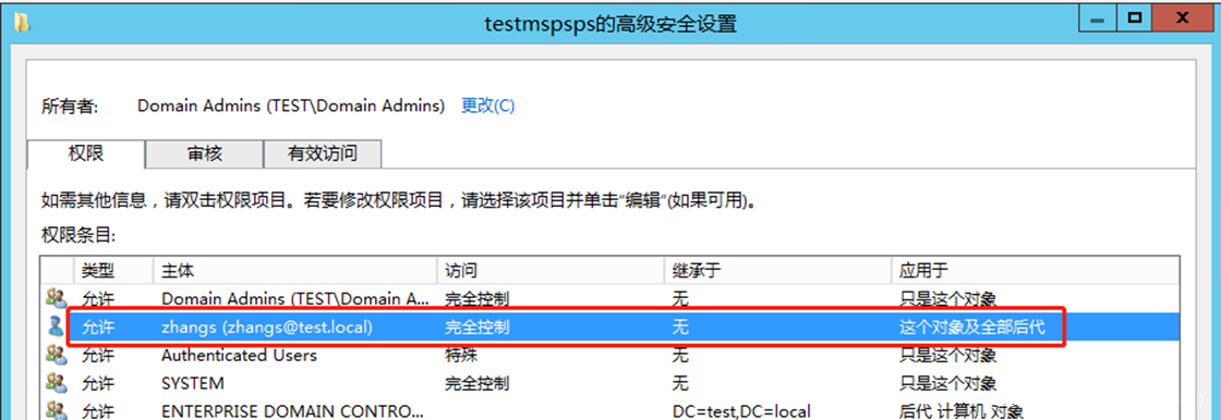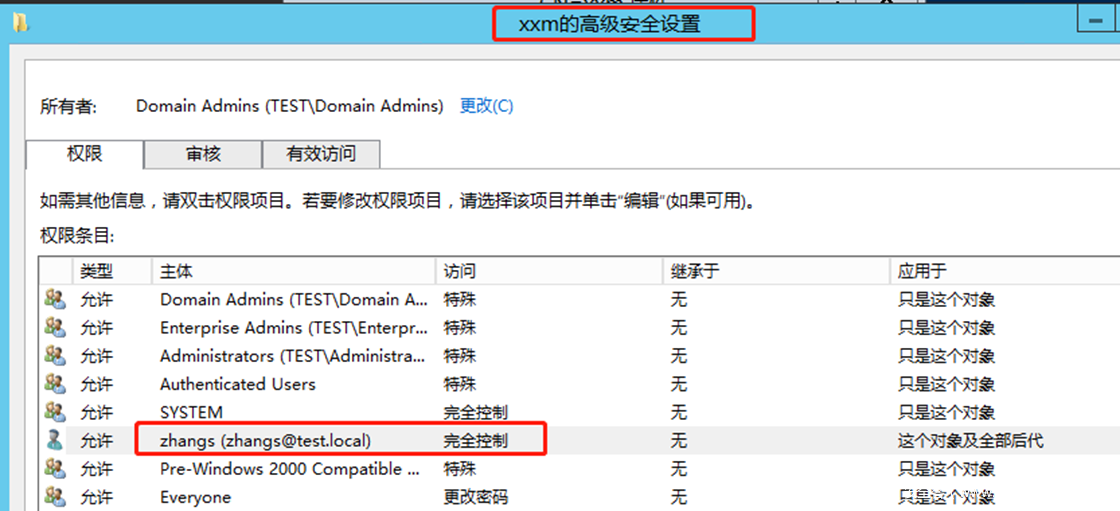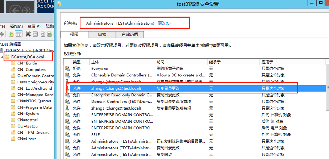 注意,这里复制目录更改权限的ACE是添加在域对象DC=test,DC=local上的。
