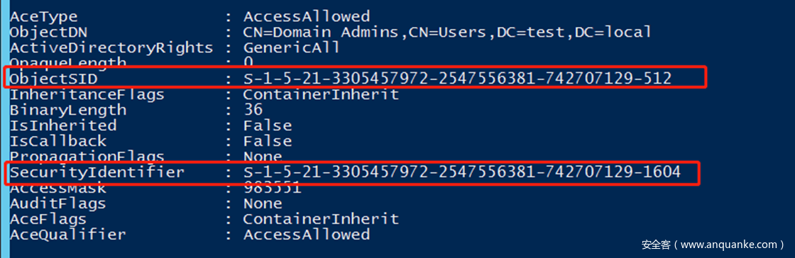 GenericAll在安全描述符中的Access Mask中进行标识,是包含了所有其他权限的权限。授予对目标对象的完全控制权,包括WriteDacl 和 WriteOwner 特权。可以使用PowerView中的Add-DomainObjectAcl进行利用。下面举例看一下如何给一个User对象添加一条GenericAll的ACE