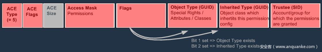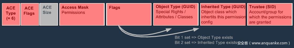 这种类型的ACE类型始终为0,设计目的是为了将权限轻松的分配给整个对象。ACE Flags确定这是继承权限还是显式给定的权限。所有此对象的子对象都会继承为ACE Type为0。