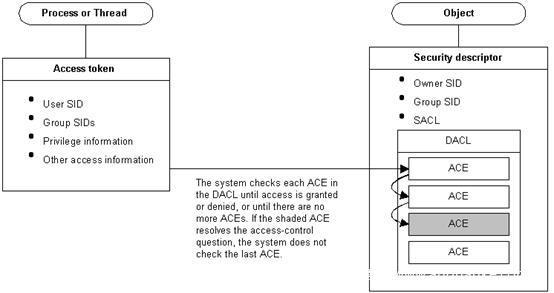 系统检查对象的DACL,查找应用于用户的ACE,并从线程的访问令牌中分组SID,系统会检查每个SID,知道授予或拒绝访问,或者知道没有其他ACE要检查为止。