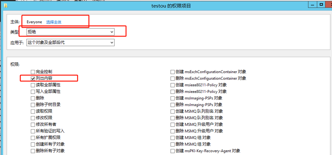 解决方法是在testou中新建一个msImaging-PSPs类型的对象testmspsps,此类容器的权限不能被Find-AdmPwdExtendedRights所遍历,同时将testwin7移动到testmspsps中,然后在testmspsps的ACL中设置主体为zhangs的完全控制权限: