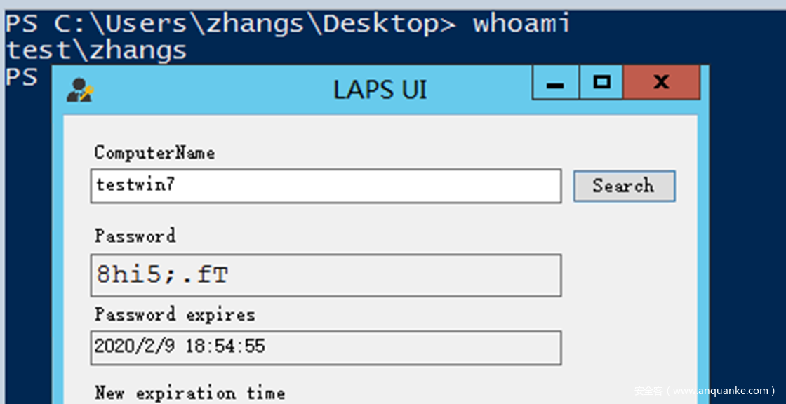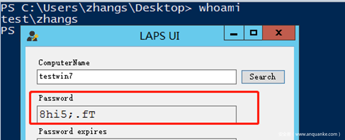 在zhangs登录的主机上使用LAPS UI尝试获取testwin7的本地密码没有成功: