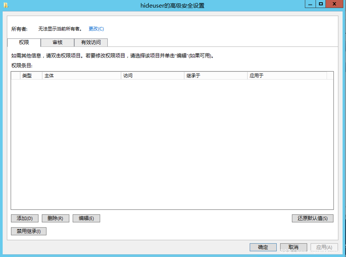点击应用之后所有用户都无法在外部访问查看此账户的ACL,包括administrator:
