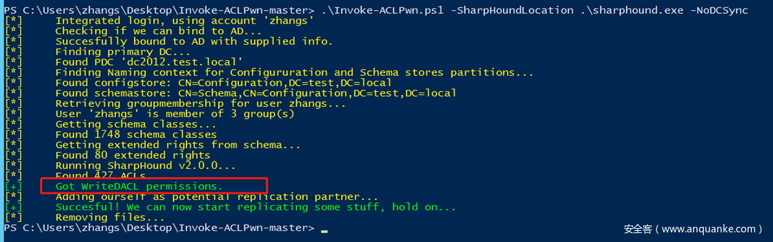 执行之后会在域对象(”DC=test,DC=local”)的DACL中添加一条主体为zhangs的权限为”复制目录更改”的ACE: